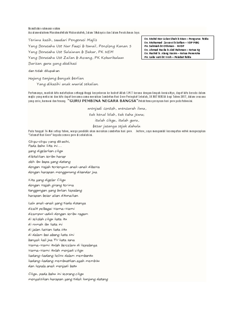 Teks Ucapan Hari Guru from imgv2-1-f.scribdassets.com Di video ini terdapat 10. Jangan pernah lelah menjadi pelita bagi negeri ini. This special day is all about you. Majlis penutupan bulan kemerdekaan malaysia. Ucapan hari guru paling dikenang sepanjang sejarah, wajib coba untuk mengucapkan kepada pendidik tunas bangsa agar mereka bangga terhadap 1. Ucapan selamat hari guru dalam bahasa inggris! Dedikasikan ucapan hari guru anda di sini. Teks ucapan hari guru mp3 & mp4.