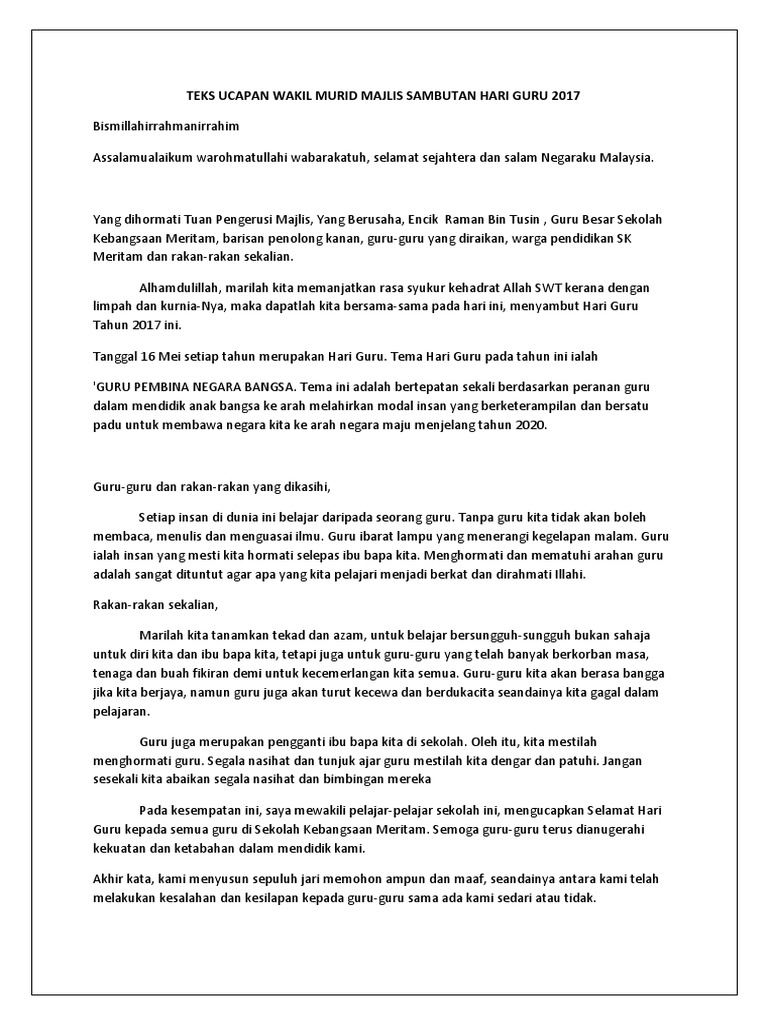 Related : Teks Ucapan Hari Guru 2017 : Majlis penutupan bulan kemerdekaan malaysia..