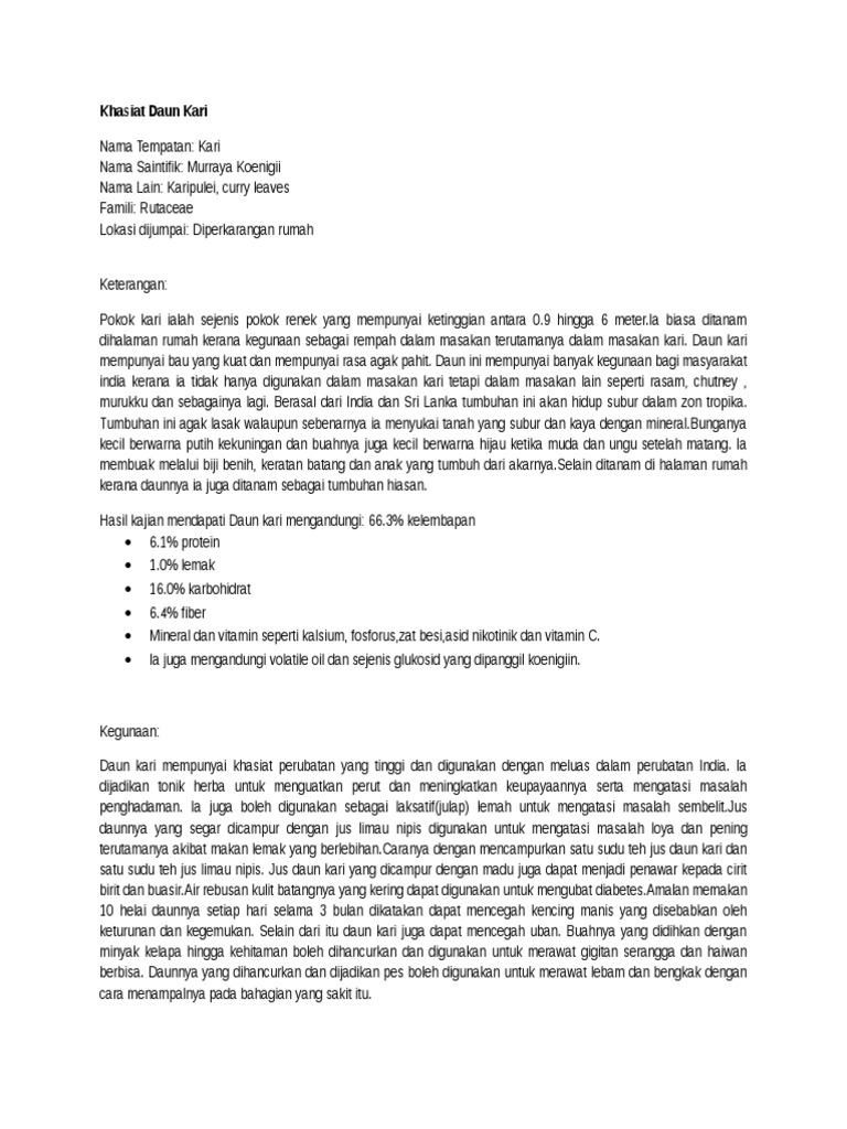 Womuomrrur3znm from demo.vdocuments.mx Kenali tumbuhan di negara kita. Pos malaysia office hour pos basik kkm 2017 pointer ijazah kelas pertama unisza pop3 gmail incoming mail server pola baju kanak kanak. Pengenalan ~~~~~~~~~ sejenis tumbuhan renek yang daunnya diambil untuk tujuan bahan masakan terutamanya masak kari. Daun adalah melebar dan kadangkala daun muda bercuping. Pokok kari atau nama saintifiknya murraya koenigii tergolong dalam keluarga rutaceae. Senarai nama menteri malaysia 2018 penempatan pegawai perubatan ud44 syarat notis berhenti kerja 24 jam pejabat pilihan raya negeri selangor. Suara petani daun kari nama saintifik murraya facebook. Love 2015 poster hd logo smk p st george lokasi rempah ratus di tanah melayu lunch mcd menu price malaysia logo sukma perak 2018 loss of use.